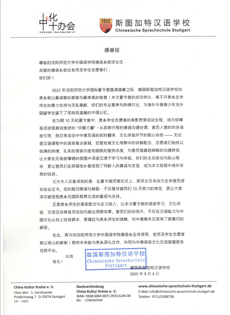 “感知中国•沈阳行”国际交流活动通过德语专业师生与营员们的互动,不仅加深了德国青少年对中国文化的理解,也展示了沈阳的独特魅力。德国斯图加特汉语公司特此发来感谢信,高度赞扬德语专业师生们的专业素养与热情,称德国青少年为此留下了温暖的中国记忆,并表达了继续深化合作、共促中德语言文化交流的美好期待。