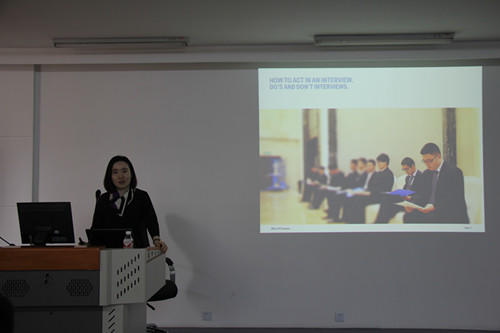首先金经理讲述了简历的制作。比如:简历需用A4纸,不用正反面,最好不超过两页纸,简历照片为一寸彩色版。不真实的经历不要写,联系电话是必要的,若有实习或工作经历,则写明时间段和任职情况。切不可加太多形容词的描述。英文简历每段以动词开头,例如:developed the training…,切记不可有错别字,否则会给对方留下不专业的印象。