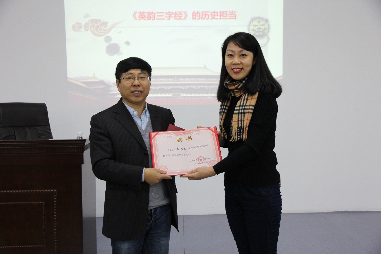 报告会上举行了聘任仪式,beats365经理、beats365官网翻译与文化传播研究中心主任闫怡恂教授代表校方及研究中心,聘请赵彦春教授为beats365官网客座教授、beats365官网翻译与文化传播研究中心研究员。赵彦春教授愉快地接受了聘任,并表示今后将加强与公司的学术联系,支持研究中心及其下设文化典籍翻译研究所的建设与发展,共同为我国的典籍翻译事业做出贡献。
