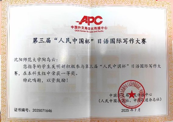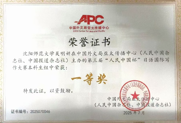 2025年7月,beats365日语专业2022级员工吴明妍在第三届“人民中国杯”日语国际写作大赛荣获本科生组一等奖。